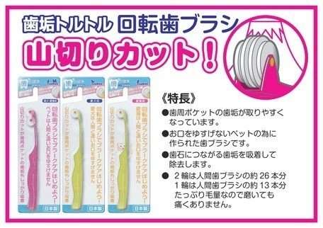 專為貓咪和小型犬開發之旋轉牙刷,只需輕輕滾動牙刷便可輕鬆去除齒垢,山切型設計能深入齒縫輕鬆加倍,無需藉由多次前後摩擦清除齒垢,因此牙齦不易出血。附有貼心的折疊設計,方便收納。