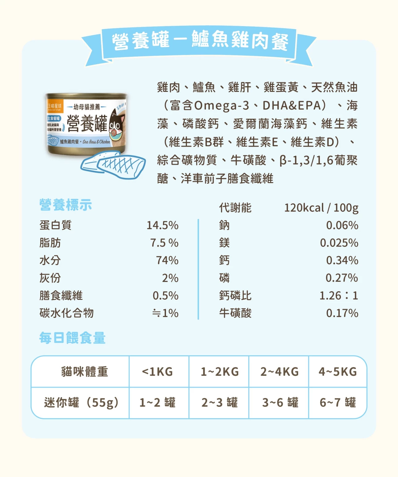 • 55g小份量,快速完食新鮮不浪費 • 含水量>70%,輕鬆補足所需水量 • 全營養主食,依據AAFCO/NRC營養標準