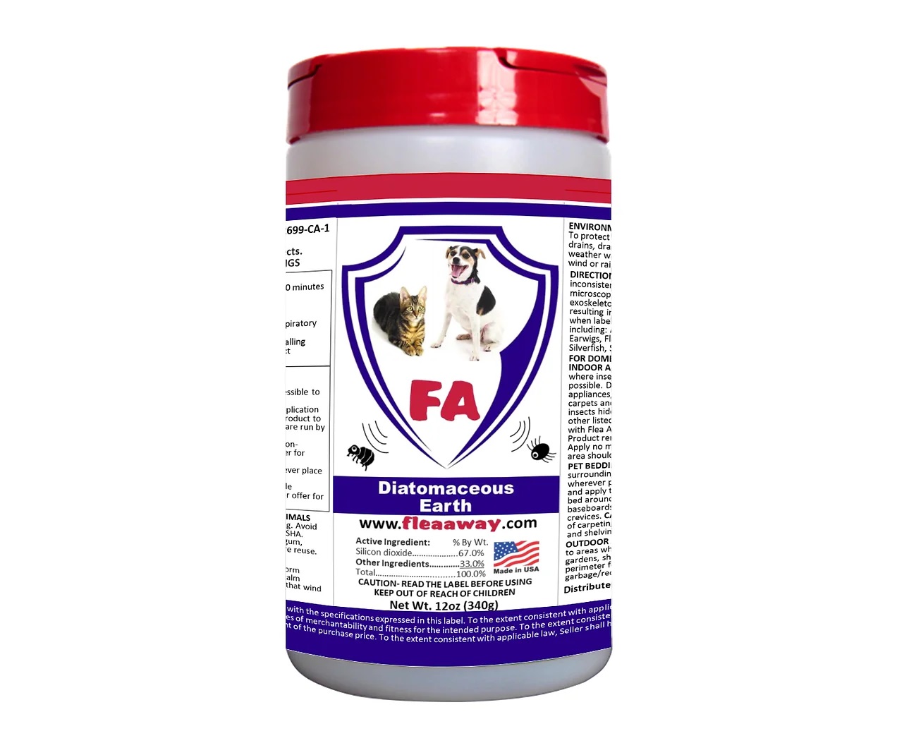 Flea Away 矽藻土對於殺死藏在地毯中的跳蚤非常有效,無論是在您的家中,還是在您的寵物可能喜歡休息的室外。 如果您沒有地毯,Flea Away 矽藻土也可以用在硬木地板上,作為殺死可能進入您生活的跳蚤侵擾的非常有效的方法。 Flea Away 矽藻土可用於殺死花園中的跳蚤。 請記住在草完全乾燥時使用它,因為水分會顯著降低其有效性。 一旦乾燥,它就會恢復全部效力。 非常適合您想要使用自然方法控制跳蚤或驅蟲的情況。 Flea Away 矽藻土對狗和貓來說是一種很好的驅蟲劑(寄生蟲不會像傳統驅蟲劑那樣產生耐受性或免疫力),每天在寵物的食物上撒一點 DE。 使用跳蚤毒藥對您的寵物和家裡的人來說都有很多危險。 Flea Away 矽藻土可有效防治各種家庭和花園害蟲,包括:螞蟻、臭蟲、銀魚、麵粉甲蟲、跳蚤、蟑螂、蛞蝓、蜈蚣、蜈蚣、千足蟲、蝽蝽、藥丸蟲、地毯甲蟲、蜘蛛、蟋蟀、科羅拉多馬鈴薯甲蟲和毛毛蟲。