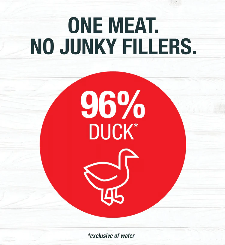 鴨肉、水、亞麻籽粉、南瓜、紐西蘭青貽貝、瓊脂、氯化鉀、氯化膽鹼、鹽、牛磺酸、乾羽衣甘藍、蔓越莓、生薑、薑黃、蛋白鐵、蛋白鋅、維生素E 補充劑、硫胺素單硝酸鹽、蛋白銅、蛋白錳、亞硒酸鈉、菸鹼酸補充劑、D-泛酸鈣、鹽酸吡哆醇、核黃素補充劑、維生素A 補充劑、生物素、碘化鉀、維生素D3 補充劑、維生素B12 補充劑、葉酸。