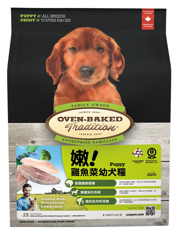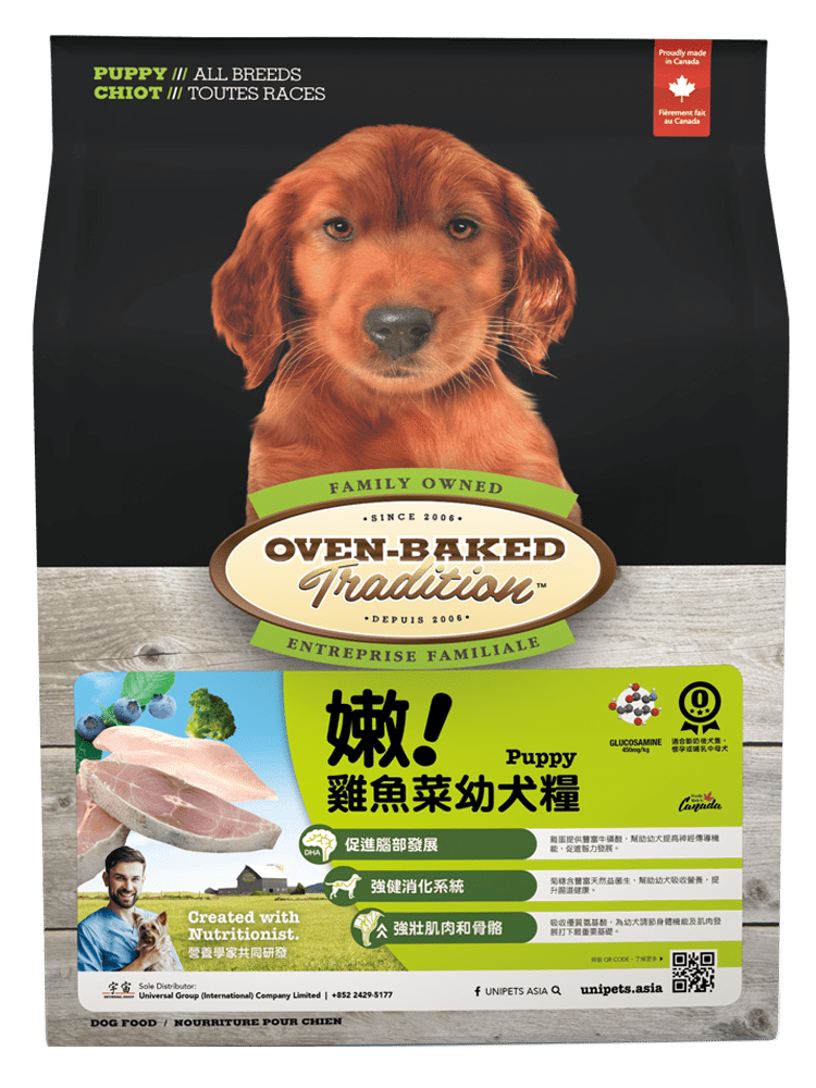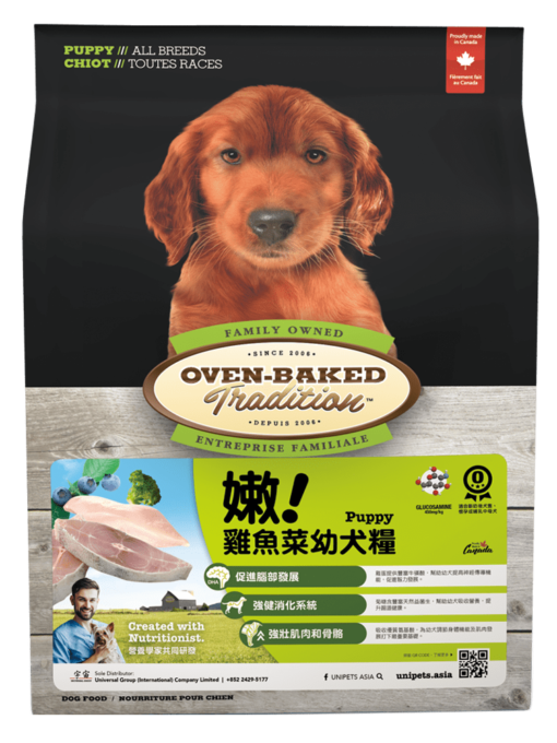 迎接新的家庭成員,為牠選一個安全而健康的佳餚,比什麼都重要!Oven-Baked Tradition幼犬糧由專業營養師調配,符合所有品種和體重的幼犬每天所需的營養,讓牠們打下良好健康基礎。以新鮮去骨雞肉作首要材料,配合均衡的鈣、磷含量,滿足發育時期的寶寶!